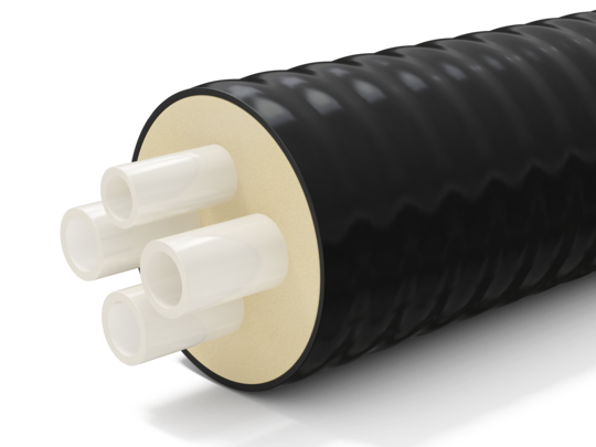 Гибкий трубопровод в четырехтрубном исполнении, пенополиуретановой изоляции. Давление P = 6, 10 бар (SDR 11; 7,4) для тепловых сетей с температурным графиком 95/70 °С (пиковая температура t = 110°С).